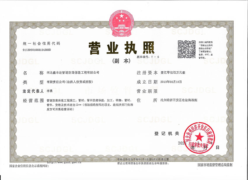 河北鑫豐達(dá)管道防腐保溫工程有限公司坐落于滄州市開(kāi)發(fā)區(qū),通過(guò)ISO9000質(zhì)量管理體系認(rèn)證。本廠(chǎng)擁有工程師4名、技術(shù)人員30名,員工60人,注冊(cè)資金5500萬(wàn)元。專(zhuān)門(mén)從事3pe/2pe防腐鋼管、保溫防腐鋼管、防腐螺旋鋼管、水泥砂漿防腐鋼管、等配套工程施工,以及防腐材料研發(fā)制造的大型專(zhuān)業(yè)化企業(yè)。是河北省防腐保溫行業(yè)協(xié)會(huì)理事單位。年生產(chǎn)能力500萬(wàn)平方米。